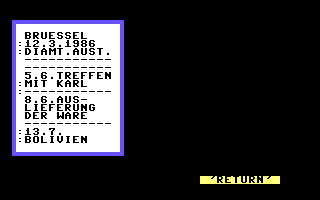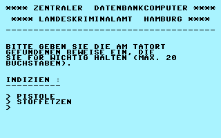 - Die Computer-Datenbank funktioniert mit eingetippten Befehlen, die drei Zeichen lang sind. Um die Eingabe von Indizien zu beenden, muß z.b. END eingetippt werden.