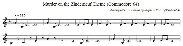 Das nachfolgende Bild zeigt die Titelmelodie in der üblichen Notenschreibweise. Für eine kreative Weiterverwendung stehen die Noten auch als PDF-Dokument (Datei:MurderOnThe Zinderneuf Theme PDF.pdf) und in der ABC-Musiknotation (Datei:MurderOnThe Zinderneuf Theme.abc.txt) zur Verfügung.
