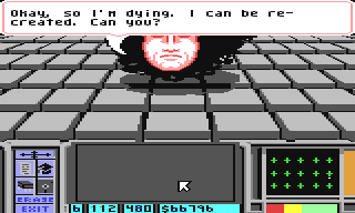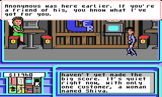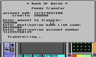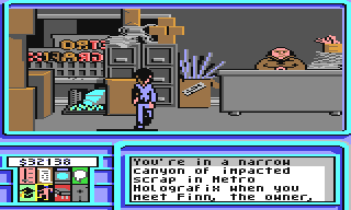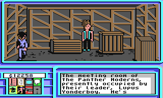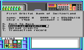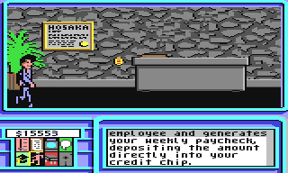 Verlassen Sie das Hotel und gehen Sie nach Norden zu Larry Moe's (Microsofts Laden). Sieht so aus als hätte der Besitzer der Polizei einiges zu erklären... Sie können nun durch die rückwärtige Tür in den Panther Moderns Meeting-Raum gehen. Lupus Yonderboy mag ein lustig aussehender Typ sein, aber sagen Sie ihm das nicht. Fragen Sie vorsichtig nach seiner Hilfe, danach fragen Sie ihn über SENSE/NET. Kaufen Sie den Pass. Fragen Sie über SKILL und kaufen Sie den Chip (Evasion). Fragen Sie ihn über "Cyberspace", "AI" und "Neuromancer". Zum Schluss fragen Sie ihn über BANK. Es sieht aus als ob er von einem gewissen Account seit Jahren absahnen würde und er gibt Ihnen die Nummer (646328356481). Schreiben Sie sich diese auf, dann gehen Sie zurück ins Hotel. Logen Sie sich in die Bankgemeinschaft mit dem decodierten Level-2 Passwort ein (Link = BANKGEMEIN, Pw = VERBOTEN) und wählen Sie Transfer Operations (Funds Transfer). Geben Sie die Account Nummer ein die Ihnen Lupus gegeben hat, dann das Ziel (Destination) BOZOBANK, die Überweisungshöhe (30000) und Ihre Account Nummer die Sie dort besitzen. Gratulation! Sie haben soeben eine Bank gehackt. (Aber das ist nur ein kleiner Betrag gegenüber dem was Sie später erhalten können). Logen Sie sich in die BOZOBANK und verwenden Sie Sequencer 1.0. Laden Sie sich die 30.000 auf Ihren Credit-Chip (Account Operatons, Download Credits).