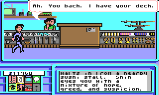 Der nächste Halt ist der Microsofts Store (Westen, Süden). Fragen Sie Larry über "Coptalk" und kaufen Sie den Chip. Implantieren Sie ihn und nun können Sie Donut World besuchen. Wenn Sie hineingehen aktivieren Sie den Chip bevor Sie mit dem Cop sprechen. Er wird Ihnen den Link-Code für die Chiba Tactical Police und die codierten Passwörter für die SEA und Fuji geben. Ihr momentaner Cryptology-Skill ist aber unzulänglich um diese Passwörter zu decodieren. Ihr nächster Job ist es daher Ihre Skills upzugraden und sich mehr Geld zu beschaffen. Sie müssen ein Cyberspace fähiges Deck kaufen und das ist nicht gerade billig!