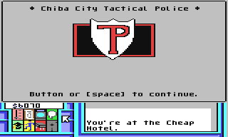 Gehen Sie zurück ins Donut World und benutzen Sie Ihren Coptalk-Chip. Wenn Sie der Cop mit selben Namen wie beim ersten Treffen nennt, gehen Sie hinaus treten wieder ein und probieren eine andere Anfangsphrase. Sie können ihn nun fragen woher die Cyber-Cowboys ihre Schwarzmarkt-Software bekommen und was das Level-2 Passwort für die Chiba Tactical Police ist. Decodieren Sie das Passwort, dann gehen Sie zum Cheap Hotel. Logen Sie sich bei der Chiba Tactical Police ein und benutzen Sie das Level-2 Passwort (Link = KEISATSU, Pw = SUPERTAC) und wählen Sie "Edit Warrants" vom Menü. Klicken Sie auf "Edit" dann auf einen Namen. Sie werden nach einen neuen Namen gefragt. Geben Sie "LARRY MOE." ein und dann seine BAMA Nummer (062788138). Logen Sie sich wieder aus.