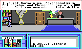 Nun fragen Sie Julius über "SKILL". Er hat "Bargaining" (nützlich aber nicht unbedingt notwendig), "Philosophy", "Phenomenology" und "Psychoanalysis". Die letzten drei werden für den Cyberspace benötigt, aber warten Sie noch bis Sie mehr Geld besitzen. Fragen Sie ihn über Cryptology und er wird Ihnen anbieten Ihre Skills zu upgraden. Upgraden Sie auf Level 2 und nun können Sie die Passwörter decodieren die Ihnen der Cop im Donut World gegeben hat. Zum Schluss fragen Sie ihn über Fuji, Hosaka, Musabori und Hitachi. Er wird Ihnen Passwörter geben aber einige können Sie mit Ihren derzeitigen Cryptology Skill noch nicht decodieren deshalb können Sie Ihren Cryptology Skill wenn Sie genug Geld besitzen gleich noch einmal upgraden lassen. Sie können aber warten bis Sie mehr Geld besitzen. Gehen Sie zurück zum Cheap Hotel.