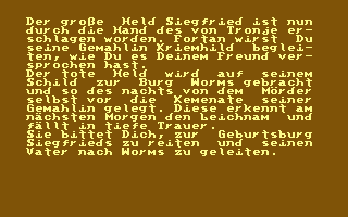 Happy Computer Ausgabe Februar 1986: "Ziemlich enttäuschend sind auch die »Nibelungen«: Der Spieler wird hier mit 35 Fragen zur Nibelungen-Sage konfrontiert und kann oft zwischen zwei vorgegebenen Antworten wählen. Ist die Entscheidung richtig, darf man weiterspielen; ist sie falsch, ist das Spiel zu Ende. Wer von dieser Sage nicht allzuviel Ahnung hat, steht ziemlich auf dem Schlauch. Wesentlich tragischer ist es, daß das Spiel sehr schnell langweilig wird. Sobald man alle Fragen richtig beantwortet hat, wird »Nibelungen« völlig reizlos. Da hat man selbst bei einem mäßig schweren Adventure mehr zu grübeln. Trotz einiger sehenswerter Grafiken eine ziemliche Enttäuschung. Wie heißt es so schön in der Werbung: »Ein völlig neues Spielprinzip...«. Ich meine ergänzend: »...das es hoffentlich nicht wieder geben wird«. " (Heinrich Lenhardt)