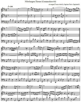 Das nachfolgende Bild zeigt die erste Seite der Titelmusik in der üblichen Notenschreibweise. Für eine kreative Weiterverwendung der Melodie stehen die Noten auch als PDF-Dokument (Datei:Nibelungen Theme PDF.pdf) und in der ABC-Musiknotation (Datei:Nibelungen Theme.abc.txt) zur Verfügung.