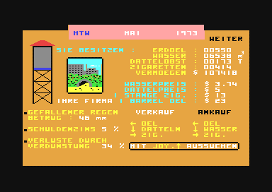 Jeder Spieler sieht den aktuellen Stand der Menge seiner Güter und darunter stehen die aktuellen Marktpreise. Es liegt nun an Jeden selbst, ob er seine produzierten Güter verkauft, behält oder gar zusätzliche Güter einkauft, um sie vielleicht später wieder günstig zu verkaufen. Alle Ankauf- und Verkaufsaktionen werden mit Hilfe des Joysticks in Port 2 ausgeführt. Die Wahl zwischen Verkaufsphase, Ankaufphase und Weiterphase erfolgt mittels Betätigung des Joysticks nach oben. Neben den Verkaufs- und Ankaufsgüter stehen Pfeile, die in verschiedene Richtungen zeigen. Folgt man mit dem Joystick eine dieser Richtungen, so beginnt man mit der Eingabe der Menge des Verkaufs oder Kaufproduktes und durch Drücken des Feuerknopfes wird die Aktion beendet. Hat man das Verkaufskriterium angewählt, so kann man durch Drücken der F1-Taste alle seine Güter auf einen Schlag verkaufen. Außerdem zeigt der Computer die Menge des gefallenen Regens, den Schuldzins und die Verdunstungsrate an. Diese Mengenangaben dienen zur Information, und brauchen nicht weiter beachtet zu werden, denn der Schuldzins tritt nur dann in Kraft, wenn man Schulden hat und der aktuelle Stand der Wassermenge im Wasserturm ergibt sich aus der gefallenen Regenmenge und der Verdunstungsrate, auf dem man keinen Einfluss üben kann.