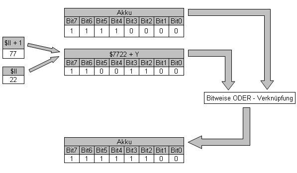 Der Assembler-Befehl ORA ($ll), Y führt eine bitweise ODER-Verknüpfung mit dem Akkumulator und dem Inhalt der Speicheradresse (LSB= $ll ; MSB= $ll+1)+Y durch.