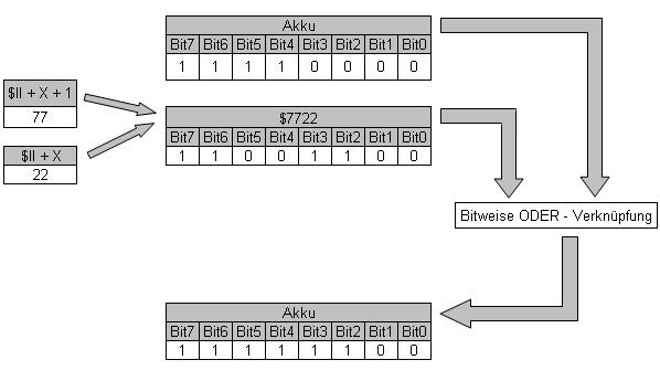 Das Ergebnis wird im Akkumulator gespeichert. Dieser Befehl eignet sich besonders zum Setzen von einzelnen Bits.