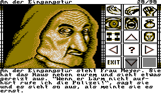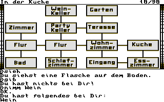 In der Kopfzeile wird der Raumname und der Punktestand angezeigt. Oben links wird die Raumgrafik angezeigt. Rechts daneben sind die anklickbaren Icons zur Bedienung angeordnet. Das untere Drittel des Bildschirms ist für Text reserviert.