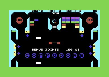 - Wenn der "Flipper" zwischen dem R und dem E von COMMODORE steht, wenn man eine neue Kugel ins Spiel bringt, gelangt die Kugel in die rechte "Seitentasche" und erhöht den Bumperbonus des rechten Bumpers um 100.