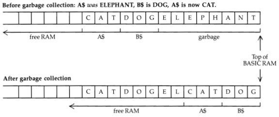Let's suppose BASIC tries to set up a new string but finds there's insufficient room. It calls a routine, the same as FRE(0), to find out which of the strings after BASIC are still being used. Strings stored within BASIC itself are outside the scope of this algorithm, and are ignored.