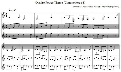 Das nachfolgende Bild zeigt die Titelmusik in der üblichen Notenschreibweise. Für eine kreative Weiterverwendung der Melodie stehen die Noten auch als PDF-Dokument (Datei:QuadroPower Theme PDF.pdf) und in der ABC-Musiknotation (Datei:QuadroPower Theme.abc.txt) zur Verfügung.