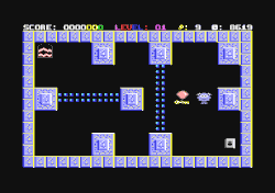 Ich machte damals Hunderte und Tausende Spiele mit SEUCK. Nyaaaah! War dann das erste, das ich als Public-Domain herausgab. Als Bonus für Binary Zone PD fügte ich Musik mit ein, eine Bearbeitung des Songs „Pianowork“, das Brian (von der Gruppe Graffity) mit DMC gemacht hatte. In dieser Zeit kam ich langsam dahinter, wie ich an meinen SEUCK-Sachen rumbasteln konnte, um sie anders zu machen. Ich hab z.B. die Farbbalken mit neuen Rasterbar-Farben aufgepeppt. Hat mir gut gefallen. In SEUCK kann man nämlich die Farbbalken eines Spiels nicht manipulieren, es sei denn, man benutzt den Maschinensprachemonitor im Action-Replay-Modul.