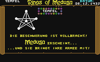 BlackKnight001: "Man darf nicht vergessen, zu welcher Zeit Rings of Medusa auf den Markt kam. Die Spiele waren viel schwieriger als heute, und lange Ladezeiten waren ebenso normal wie - mangels Maus - eine umständliche Steuerung. Vor diesem Hintergrund war R.O.M. ein absolutes Highlight zu seiner Zeit, und ist heute noch eines der wenigen C64-Games, die ich noch mit Begeisterung spiele. Das Handbuch ist knapp gehalten, vieles muss man selbst herausfinden. Gerade die Schlachten erfordern Erfahrung, sonst hat man keine Chance. Aber da die Truppen mit jedem Kampf an Erfahrung gewinnen, werden sie auch stärker und die Erfolgserlebnisse zahlreicher. Viele Elemente verschiedener Genres kommen bei R.O.M. zusammen: Handels-Simulation, Strategiespiel, auch RPG-Elemente, allerdings ohne einzelne Helden. Dieses Game hätte Potential für eine Neuauflage mit moderner Grafik! 9 von 10 Punkten."