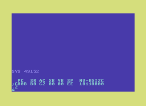 Das NEW vor dem SYS-Befehl verhindert eine spätere Fehlerausgabe "OUT OF MEMORY", wenn BASIC benutzt werden soll. Das Programm liegt vollständig in einem 4 KByte großen Speicherbereich, in der Standardversion zwischen $C000 und $CFFF. Nach dem Start wird der Bildschirmhintergrund und die Rahmenfarbe auf Blau sowie die Zeichenfarbe auf Türkis gesetzt und die Registerbelegung angezeigt.