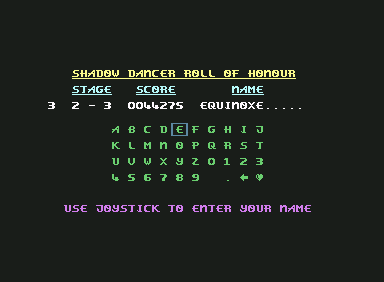 Shadow Dancer ist eine Fortsetzung von Shinobi und erschien 1989 zunächst als Arcade-Automat. 1991 wurde das Spiel für den C64 umgesetzt. Das Spiel ist dabei ähnlich wie sein Vorgänger konzipiert. So steuert man einen Ninja durch Plattform-Levels mit zwei Ebenen, zwischen denen man wechseln kann, und muß Feinde mit Shuriken und Katana ausschalten. Dazu hat man eine begrenzte Zahl an Spezialangriffen mit "Ninja-Magie". Befreite man im Vorgänger Geiseln, muß man man jetzt über den Level verteilte Bomben mit Zeitzünder finden. Neu ist ein Begleiter in Form eines Hundes. Immer, wenn der Hund bellt, kann man ihn auf Tastendruck anweisen, den nächsten Gegner anzufallen, wodurch dieser für eine Zeit abgelenkt ist und so einfacher ausgeschaltet wird. Ist der Gegner jedoch zu stark gepanzert, vergeht zuviel Zeit oder kann er den Hund vorher abwehren, verwandelt sich der Hund in einen Welpen und kann nicht mehr helfen. Sobald man die nächste Zeitbombe ausgeschaltet hat, erhält der Hund wieder seine normale Größe. Zwischen den Levels gibt es ein Minispiel als Bonusrunde. Dabei muß man man von einem Gebäude etagenweise herunterspringende Ninjas abschießen, bevor einer am Boden angekommen ist.