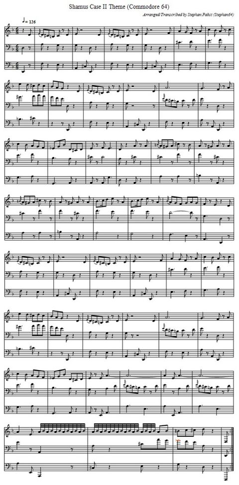 Das nachfolgende Bild zeigt die Titelmelodie — eine verkürzte Version von Charles Gounods Musikstück "Trauermarsch einer Marionette" — in der üblichen Notenschreibweise. Für eine kreative Weiterverwendung stehen die Noten auch als PDF-Dokument (Datei:ShamusCaseII Theme PDF.pdf) und in der ABC-Musiknotation (Datei:ShamusCaseII Theme.abc.txt) zur Verfügung.