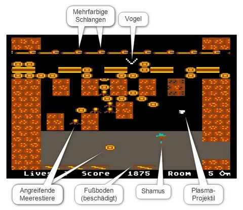 In Räumen mit gemauertem Fußboden, sowohl einem Höhlensystem als auch in nach oben offenen Räumen, steuert der Joystick lediglich die Bewegung der Figur: Auslenkungen nach links und rechts lassen Shamus in die entsprechende Richtung gehen; in Kombination mit dem Feuerknopf springt Shamus und überwindet auf diese Weise Gruben oder Lücken im Boden. Falls er sich auf einer Leiter befindet, so lassen Joystickbewegungen nach oben oder unten Shamus aufwärts oder abwärts klettern.