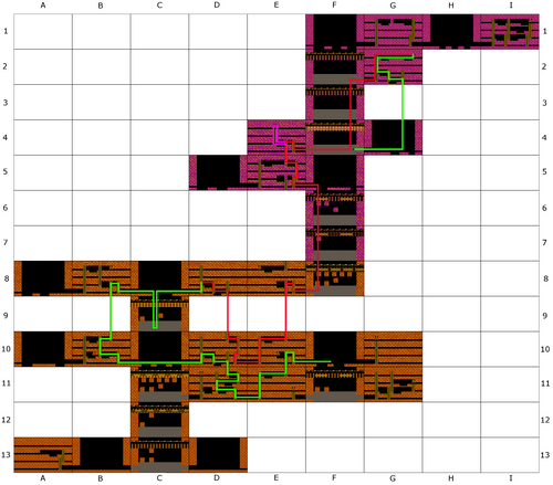 Die folgende Galerie zeigt — der Übersíchtlichkeit halber auf vier Abschnitte aufgeteilt — den Weg zum Kontrollraum, vor dem aus sich die Sprengung von Shadows Burg auslösen lässt (Bild 1—3), und den anschließenden Rückweg zum Startraum (Bild 4). Wege mit mitgeführtem Schlüssel sind grün, Wege ohne Schlüssel sind rot eingezeichnet. Umwege, die nur dem Erwerb von zusätzlichen Leben dienen, sind violett gefärbt.