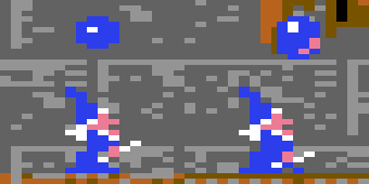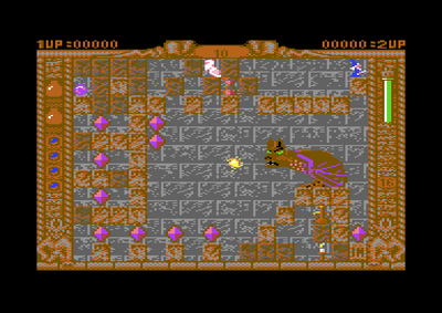 ("Feuerknopf halten" und "Joystick nach unten ziehen"), für knapp zwei Sekungen befreit werden. Nun fliegt der Ball durch den Raum (siehe Animation rechts) und vernichtet Monster, die er trifft. Mit dem gleichen Joystickbefehl kann der Ball dann auch wieder eingesammelt werden.