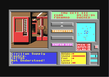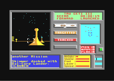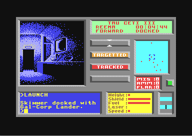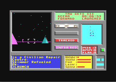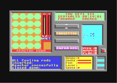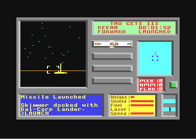 - MAP : Der Computer zeigt eine zoombare Karte von Tau Ceti an, die Informationen über die Städte enthält. Der Cursor kann mit dem Joystick bewegt werden, der Feuerknopf wählt Funktionen.