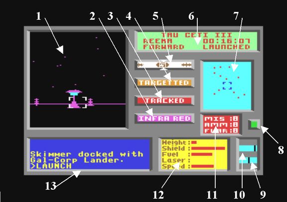 - Das gelbe Fenster (12) enthält Informationen über Flughöhe, Status des Schutzschildes, Treibstoffvorrat, Temperatur des Lasers und Geschwindigkeit. Rechts daneben befinden sich