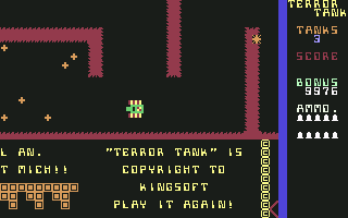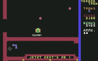 Terror Tank ist ein Shoot'em Up. Man steuert einen Panzer durch ein Labyrinth voller Fallen und Gegner, und muss die sieben Teile einer Maschine namens Hypercom dort finden. Der Panzer hat nur begrenzt Munition, im Labyrinth findet man jedoch Munitionsdepots, die den Vorrat einmalig auffrischen. Kollisionen mit Objekten, auch den Wänden, sind tödlich, sofern es nicht Depots oder Teleporter-Felder sind