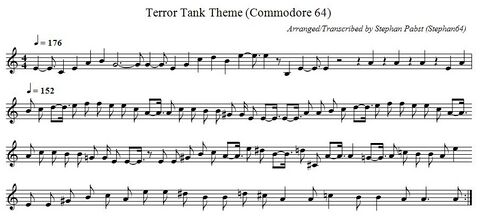 Die musikalische Untermalung besteht aus zwei Melodien, die im Intro und während des Spiels erklingen. Die Titelmusik im Intro lässt sich allerdings nicht im üblichen Notenschema wiedergeben, so dass das nachfolgende Bild nur die Begleitmusik des Spiels zeigt. Diese Musik besitzt keine erkennbare Taktart, und die Notenlängen stehen teilweise im Verhältnis 5:3 = 1.67, was notgedrungen mit 7/4:4 = 1.75 angenähert wird. Für eine kreative Weiterverwendung stehen die Noten auch als PDF-Dokument (Datei:TerrorTank Theme PDF.pdf) und in der ABC-Musiknotation (Datei:TerrorTank Theme.abc.txt) zur Verfügung.