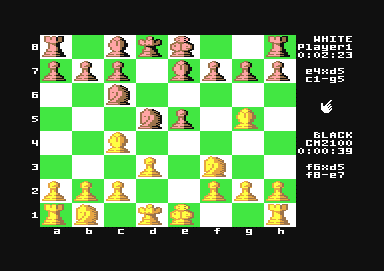 - Spiel von Diskette laden: Ein von Ihnen gepeichertes Spiel oder eines der 110 auf Diskseite "B" gespeicherten klassischen Schachspiele von Diskette laden. Um ein klassischen Spiel Zug für Zug anzusehen, drücken Sie nach dem laden die Tasten "CTRL"+"R" für jeden Zug.