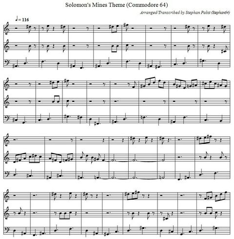 Die Titelmelodie ist eine dreistimmige Aneinanderreihung von Tönen und Pausen ohne erkennbare Struktur. Das nachfolgende Bild zeigt diese Melodie in der üblichen Notenschreibweise. Die Taktstriche unterteilen das Stück hierbei nicht in Abschnitte gleicher Länge, sondern dienen lediglich der Synchronisation zwischen des einzelnen Stimmen. Für eine kreative Weiterverwendung stehen die Noten auch als PDF-Dokument (Datei:SolomonsMines Theme PDF.pdf) und in der ABC-Musiknotation (Datei:SolomonsMines Theme.abc.txt) zur Verfügung.