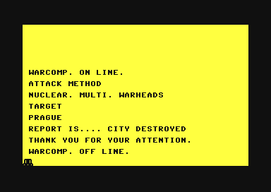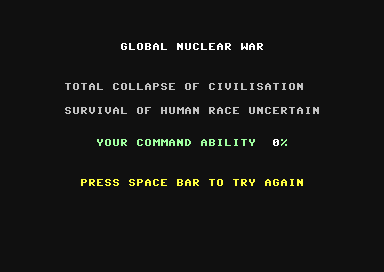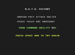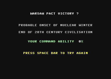 Das Spiel kommt grafisch recht nüchtern daher. Das Schlachtfeld wirkt beinahe so, als sei es mit dem Commodore-eigenen Zeichensatz erstellt worden. Das rundenbasierende Prinzip steigert sich, bis es am Ende unweigerlich zum Auslösen eines Nuklearkrieges kommt. Es scheint unmöglich mit konventionellen Waffen den Krieg für eine Seite zu entscheiden.