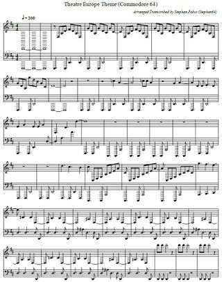 Das nachfolgende Bild zeigt die Titelmelodie in der üblichen Notenschreibweise. Für eine kreative Weiterverwendung stehen die Noten auch als PDF-Dokument (Datei:TheatreEurope Theme PDF.pdf) und in der ABC-Musiknotation (Datei:TheatreEurope Theme.abc.txt) zur Verfügung.