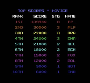 - F7 : Spiels hält an (Pausefunktion). Es wird dann auch die aktuelle Stage (Level) und die höchste Score der Highscore angezeigt.