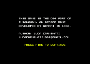 Diese fast originalgetreue Umsetzung des Action-Arcade-Klassikers "Tutankham" (zu deutsch: Tutanchamun) von Konami ist als Hommage und Fan-Projekt vom Programmierer Luca Carminati für den C64 entstanden.