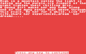 N, SAY HELLO, SAY WHO ARE YOU, SAY WHERE DO YOU LIVE, SAY WHERE ARE YOU GOING, SAY ARE YOU HUNGRY, SAY ARE YOU THIRSTY, SAY ARE YOU SICK, SAY ARE YOU TIRED, SAY ARE YOU COLD, SAY ARE YOU LOST, SAY WHAT IS WRONG, SAY CAN I HELP YOU, SAY FOLLOW ME (Er geht mit Ihnen zu Ihren Haus), N, LOOK AROUND, EXAMINE WINDOW, PULL CURTAINS (dies schützt David vor Mondschein), REMOVE CLOTHES, GET IN BED, KISS DAVID (Sie verlieben sich in David. Am nächsten Tag geht Davids Reise weiter. Sie verkörpern nun wieder David und begegnen bei einer Grenzkontrolle einigen Wächtern die Sie nach Ihren Reiseziel fragen), LOOK AROUND, ANSWER ASHENLEA (sie werfen Sie in der Festung ins Gefängnis), PRETEND TO DIE (als die Wächter kommen um nach Ihnen zu sehen entkommen Sie in einen kleinen Raum), LOOK AROUND, EXAMINE CEILING, JUMP (Sie klettern auf den Pfeiler damit sie die Wachen nicht finden), D, N, E, N, W, N, W, S, W, S, SEARCH ALCOVE, GET NET, GET NAIL, BEND NAIL (zu einem Haken), UNRAVEL NET (Sie erstellen ein Seil), TIE CORD TO HOOK, N, E, N, E, E, U, W, W, D, EXAMINE GRILL, LOWER HOOK (ein Schlüssel hängt am Haken), U, E, E, D, W, W, UNLOCK DOOR, N, GET SWORD, GET ARMOUR, EXAMINE PEG (der Gegenstand gehört Olaf), S, E, E, U, W, W, S, KILL GUARD (ohne Rüstung sind Sie leise und können die Wache töten), WEAR ARMOUR, N, E, E, S, S, SAY OLAF (Sie werden nicht erkannt und gehen Richtung Westen auf Patrollie), LOOK AROUND, REMOVE ARMOUR, JUMP (Sie springen ins Wasser und schwimmen zum Ufer), W (der Mond scheint. Sie erreichen Ashenlea als Werwolf!), LOOK AROUND, STEP TRAP (Sie stecken bis zum Morgen in der Falle fest), SHOUT (der Einsiedler kommt Ihnen zu Hilfe), THANK HERMIT