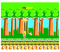 Auf dem Weg zur seiner Holden muss Wonderboy über verschiedene Plattformen und Schluchten springen und dabei allerlei Getier außer Gefecht setzen. Um ausreichend Energie zu haben, findet sich unterwegs Essen in Form von Früchten oder Süßem bzw. Sandwiches. Außerdem gibt es Feuer und Felsen, welche ihm den Weg versperren.
