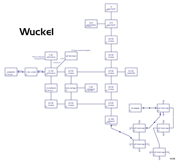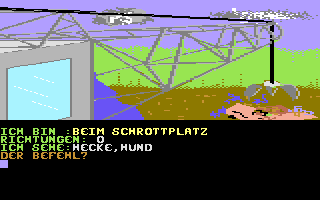 INVENTAR (Man besitzt 3,50DM), NIMM FAHRPLAN, GEHE ZUG, SCHAU, LESE FAHRPLAN (Man sollte den Bahnhof nun in Richtung Einkaufspassage verlassen um die Teile des Staubsaugers zu suchen – und zu finden), WARTE, WARTE (Man sollte nun bei der Einkaufspassage angekommen sein), VERLASSE ZUG, SCHAU, UNTERSUCHE TUER (Sie ist nicht abgesperrt), OEFFNE TUER, GEHE TUER, SCHAU, NIMM SEIL, NIMM STOFFPANTOFFELN (Man zieht sie an), UNTERSUCHE MANN (Ein Schlüssel liegt in seinem Schoß), NIMM SCHLUESSEL (Man muß die Pantoffeln tragen), S, BESTEIG BUCHE, WIRF SEIL (Man erhält den Hypertreibstoffbehaelter), O, S, SCHAU, GEHE TUER, SCHAU, 1 (kaufen), 2 (Man kauft eine Wurst), W, N, O, N, N, N, W, SCHAU, GIB WUERSTEL (Man findet den Filter), O, OEFFNE TUER (Mit dem Schlüssel), UNTERSUCHE REGALE (Man findet einige Nüsse), NIMM NUESSE, S, S, S, S, W, W, S, UNTERSUCHE BAEUME (Man bemerkt ein Glitzern), UNTERSUCHE KLETTEROLM, GIB NUESSE (Man erhält die Batterie), N, O, O, O, NIMM ZAPFHAHN (Dazu benötigt man den Hypertreibstoffbehaelter)